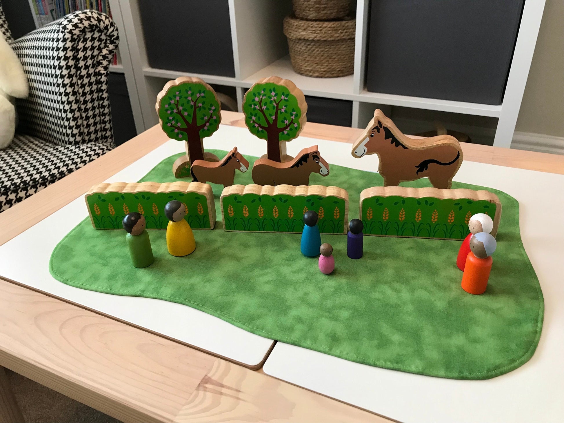 The Play Mat is double sided; which offers open ended play situations and encourages imagination. One side features a beautiful Grassy scene with hidden Bunnies and Eggs…perfect for Springtime and a Easter play. The reverse is Light Green and an ideal open ended base for Fairies, Woodland, Farms, Grasslands etc.