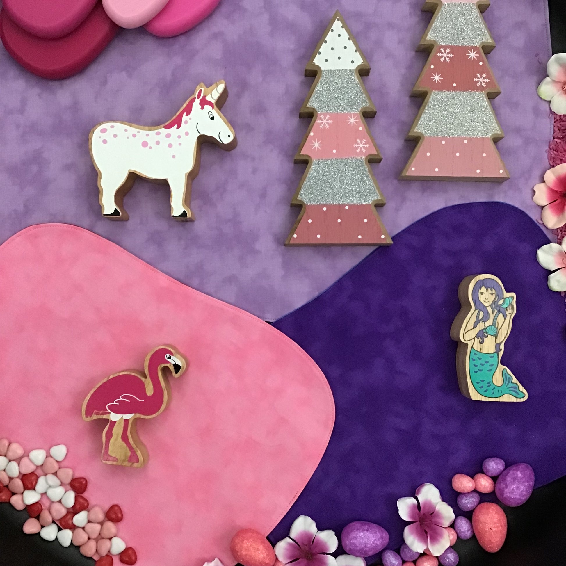 The Play Mats are double sided; which offers open ended play situations and encourages imagination. Mixing them up and changing the combinations for lots of different themes. Use them as a set of three, two or on their own. This set has a Large Jade/Lilac and Deep Blue/Purple and Red/Pink Small Play Mats.
