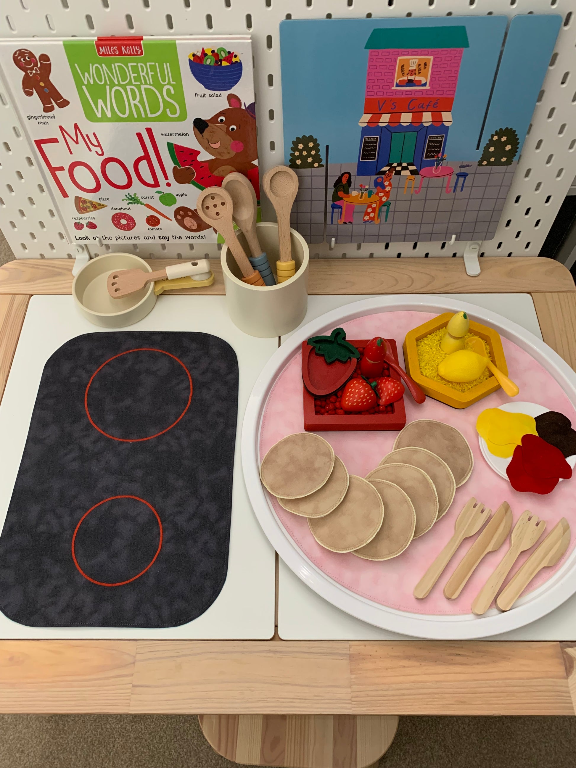 IN STOCK - UKCA Tested - Cooking Hob Themed Tray Play Mat size with two Red rings. Lightweight, washable and offers endless open-ended/small world play options for your child.