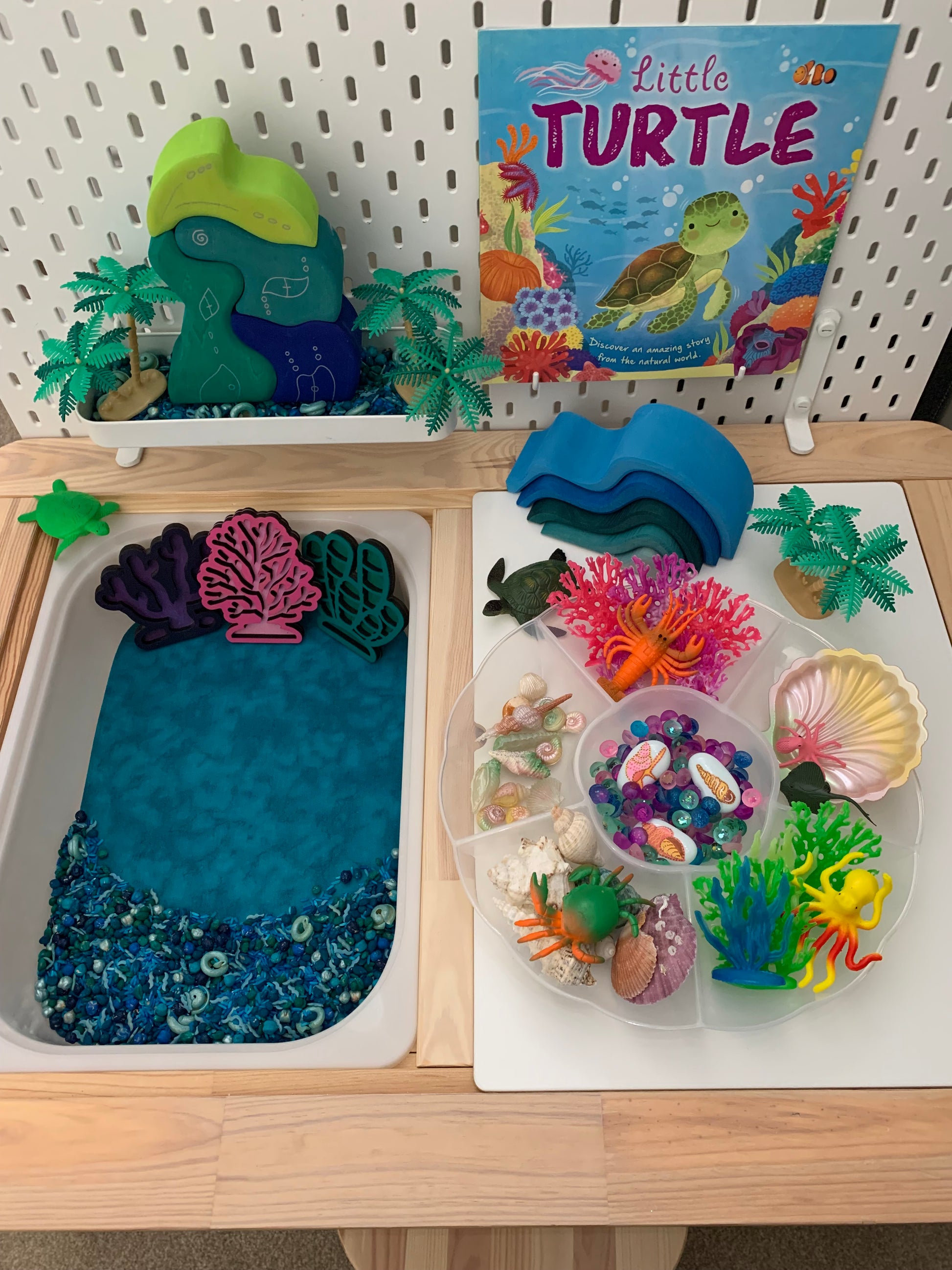 The play mat is reversible and the reverse side is jade…ideal for coral reefs, pirates and mermaids, oceans, more space, dinosaur, etc.