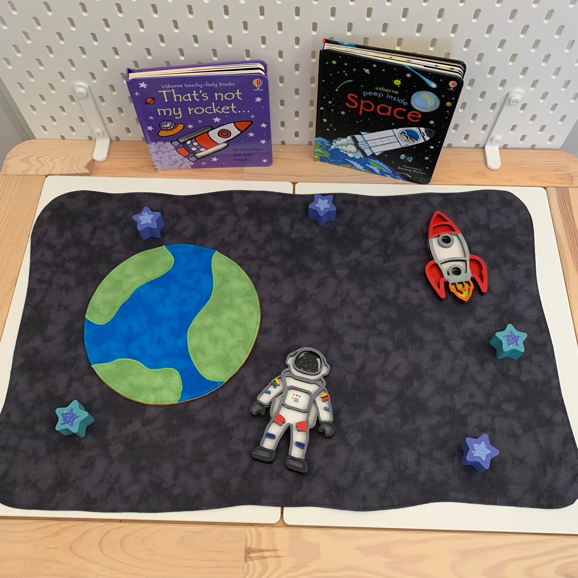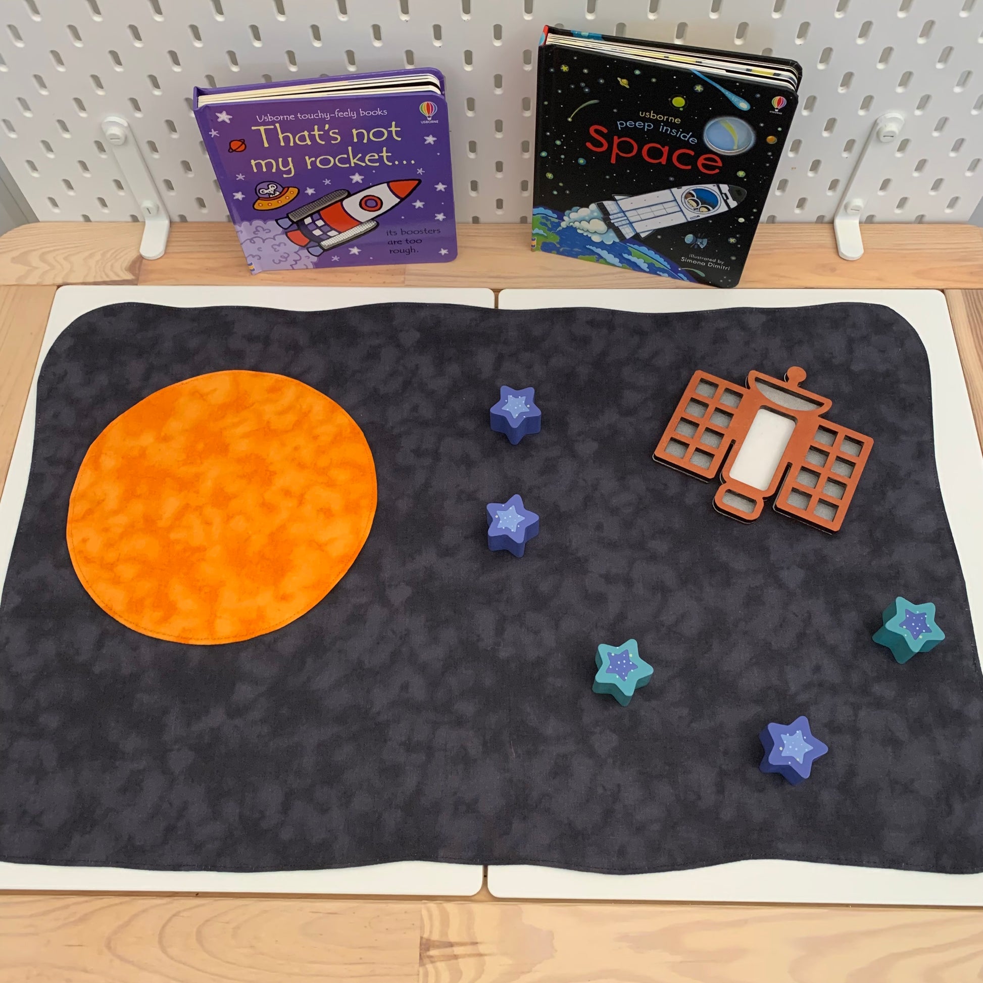 Circular Reversible Earth/Sun - Deep Blue Oceans with 3 Light Green Land Masses - Orange Reverse - Extra internal construction to avoid stitching showing through. Please not all circular play mats are not ‘perfect’ circles due to the closing and reversing process.