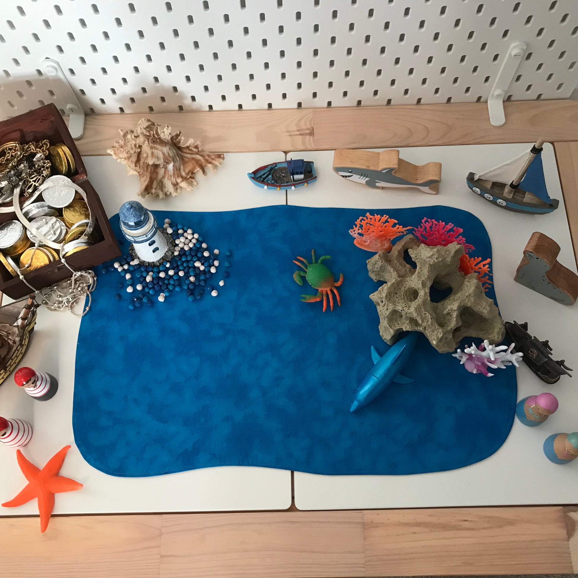 Large Frozen Lake design which is great for small world play and skating peg dolls. The reverse is Deep Blue and the perfect open ended base for all kinds of Ocean, Pirate, Mermaids, Water, Space or even more Winter and Polar based play…also great for all year round set ups too.