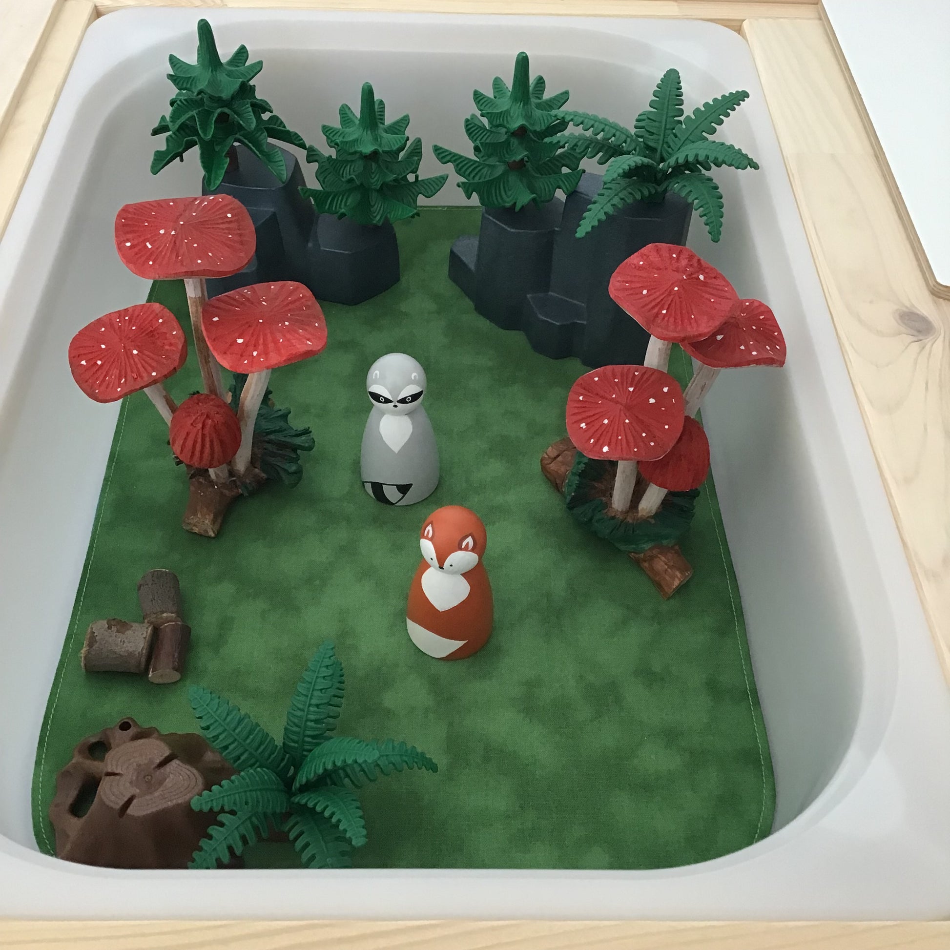 The mat is double sided; which offers open ended play situations and encourages imagination. The front of the playmat is Black and features a Purple Lake/River...perfect for spooky play and all the ghost and ghouls. This reverse side is Dark Green...giving lots of possibilities for different themes...including Forest, Grasslands, Gardens, Fairies, Dinosaurs etc.
