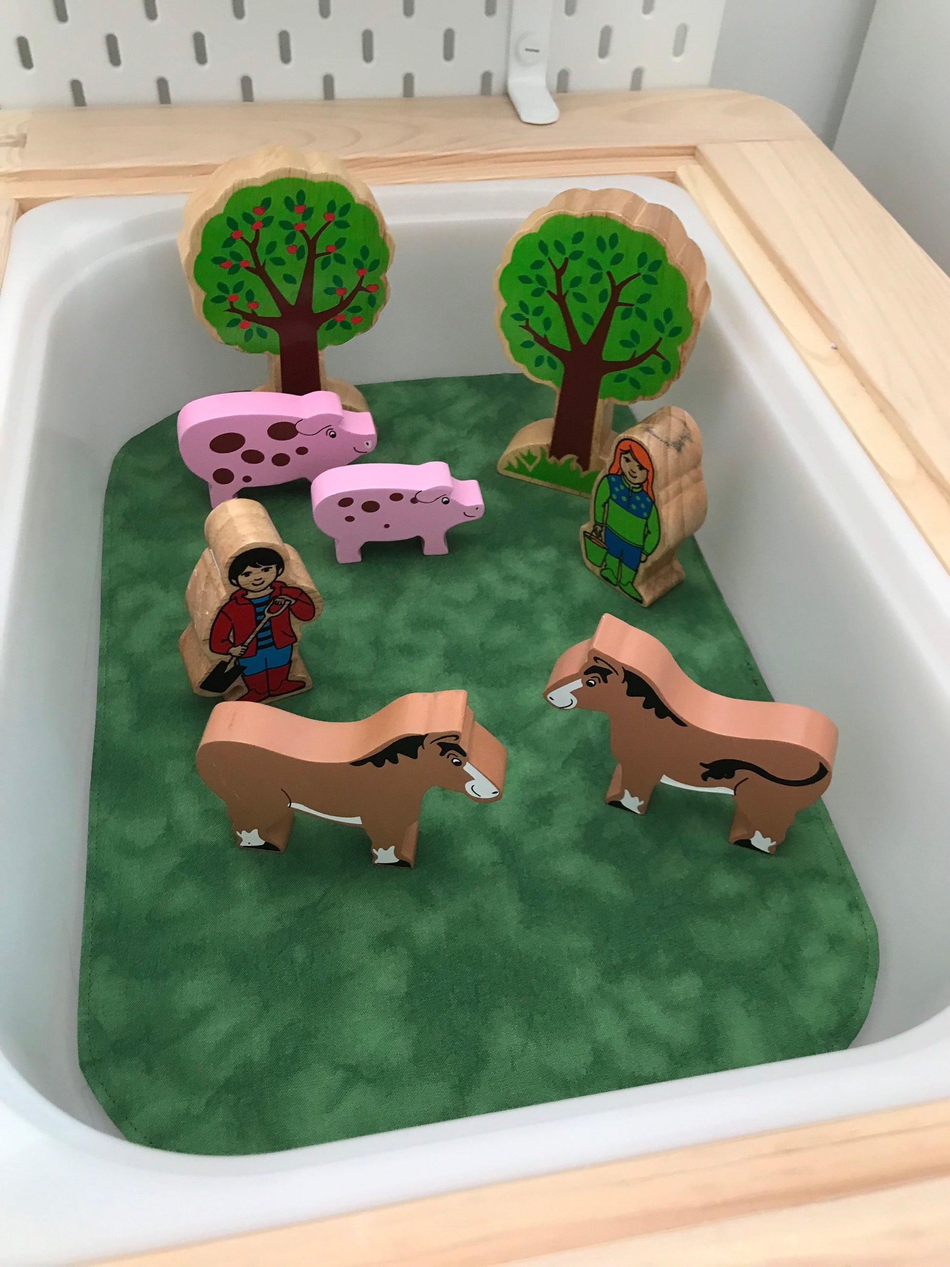 The mat is double sided; which offers open ended play situations and encourages imagination. This mat has one side that is Deep Blue and features a grey rock formation that can be used as a rock pool or under the sea rocky area. The Reverse side is Dark Green...giving lots of possibilities for different scenes...including Farm, Woodlands and Forests, Fairies and Fantasy Lands, Dinosaurs etc.