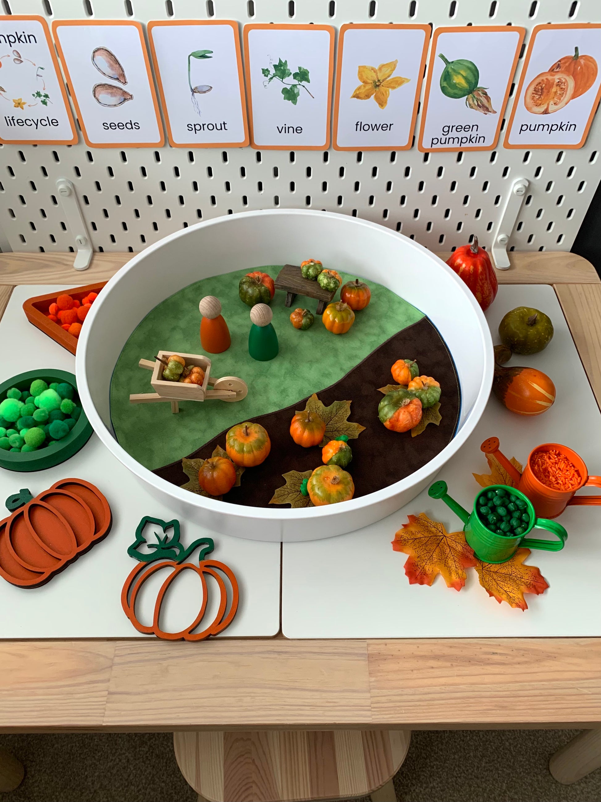 The play mat is reversible; which offers open ended play situations and encourages imagination. One side has a Light Green base with a rich Brown Earth section...perfect for pumpkin patches, sunflowers, vegetable and garden play. The reverse side is Deep Blue and perfect for all kinds of Ocean themed play, Polar adventures, Space and much more.